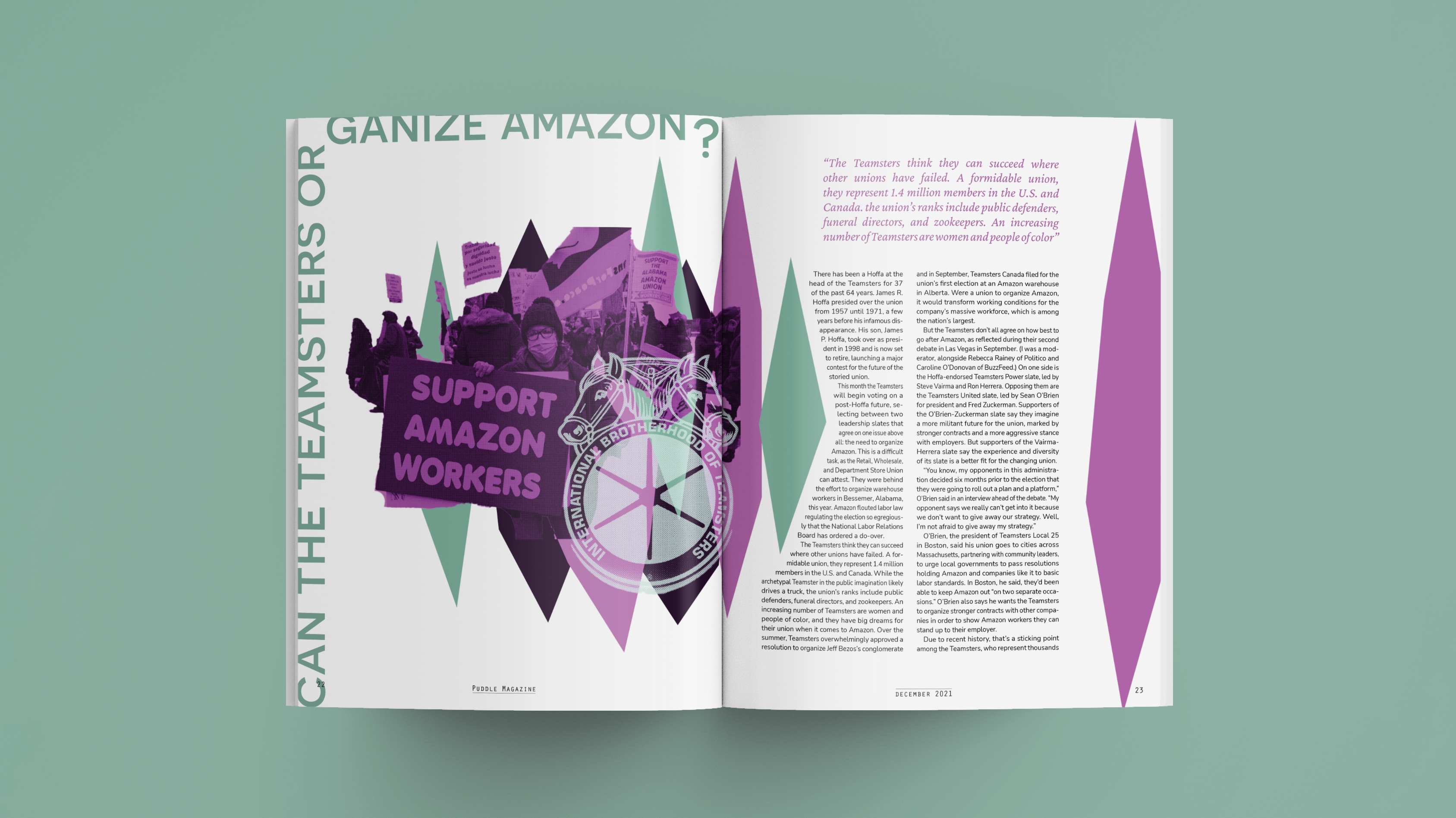 The Puddle style can be defined as organic and soft, with desaturated primary and secondary colors. The photo collages are primarily edited with the brand colors, with one exception for a specific figure. The layout influences are broad and disparate, with fonts and illustration style unifying the different magazine spreads.